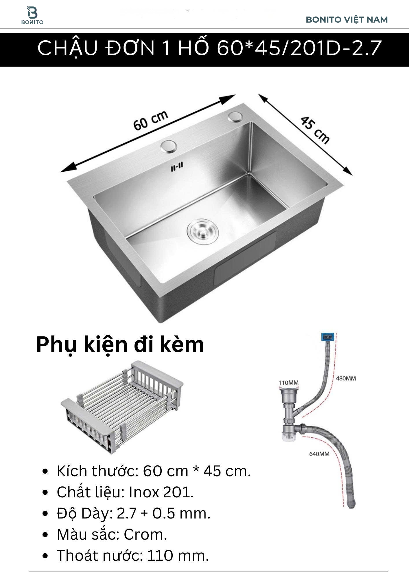 Chậu rửa đơn tiện lợi cho không gian nhỏ. Inox cao cấp, bề mặt sáng bóng, chống trầy xước và dễ làm sạch.