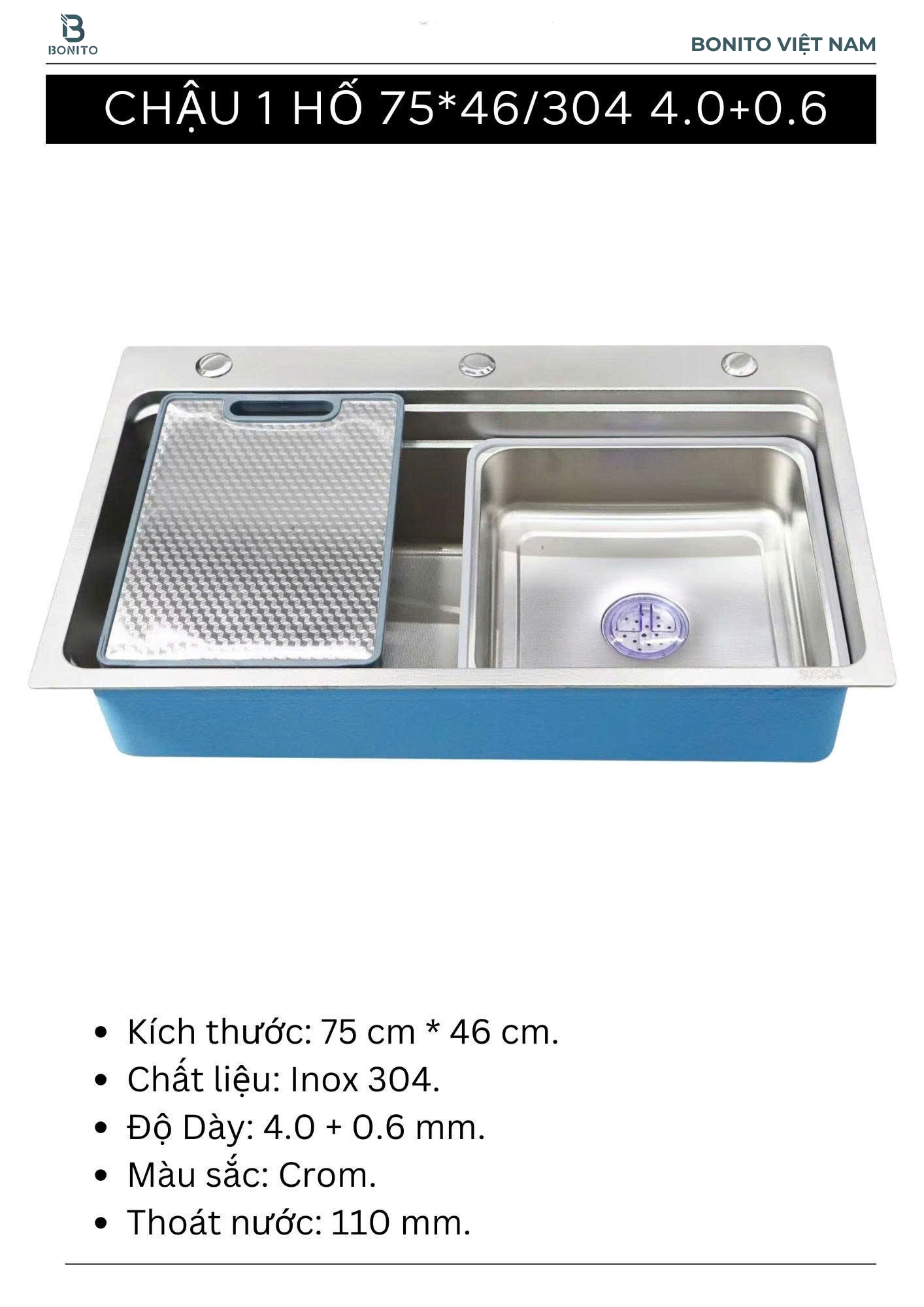 Chậu rửa đơn thiết kế nhỏ gọn, chất liệu Inox 304 cao cấp mạ Crom sáng bóng, phù hợp mọi không gian bếp.