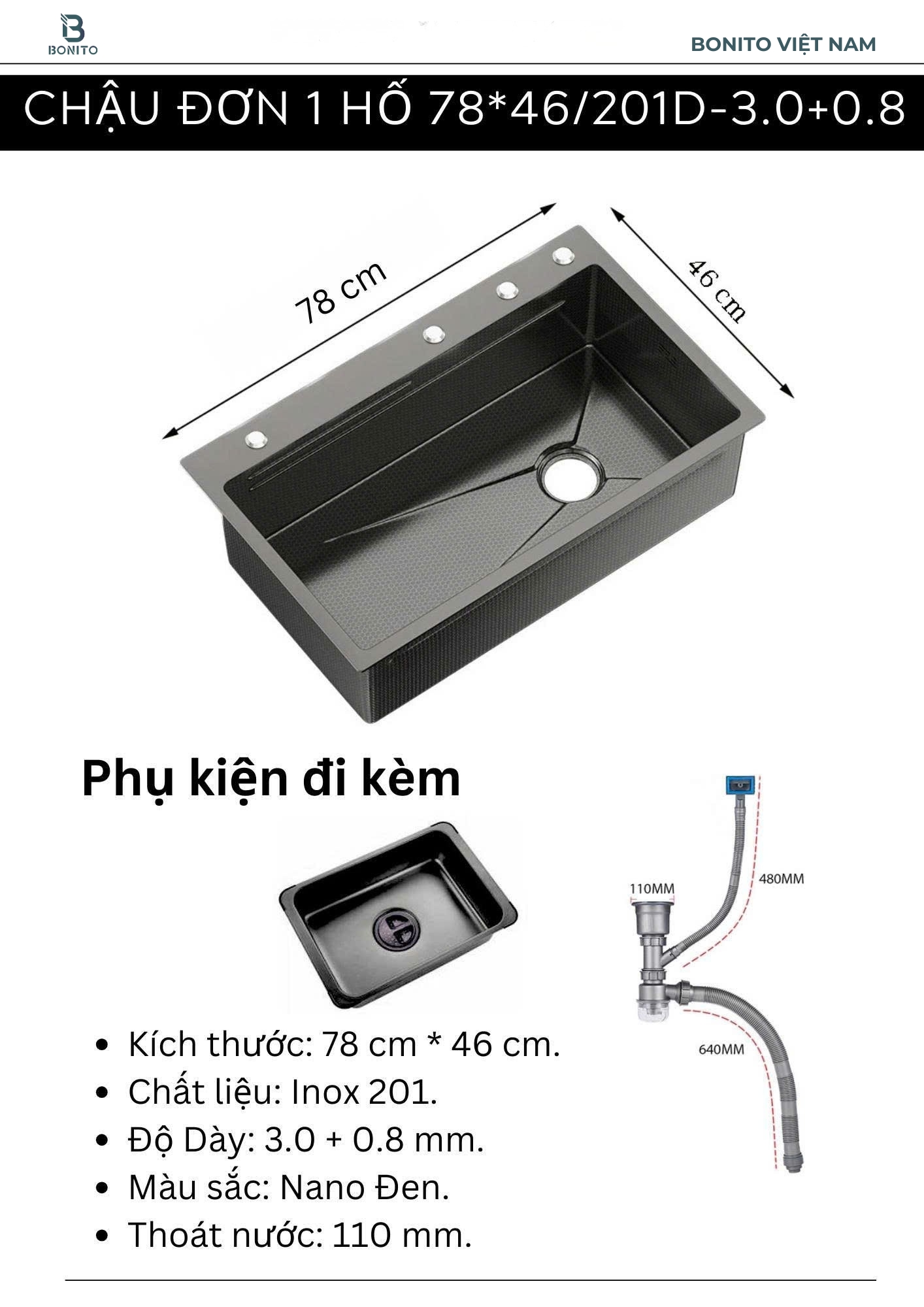 Phiên bản Inox 304 phủ Nano Đen cao cấp, bền đẹp, chống trầy xước, chống bám dầu và mang lại vẻ sang trọng cho không gian bếp.