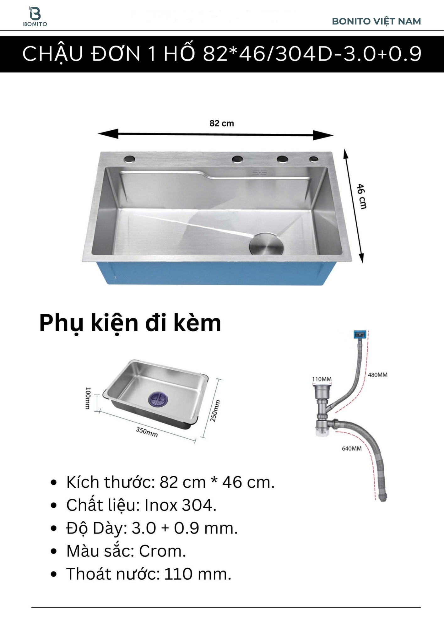 Chậu đơn rộng rãi, thiết kế Inox 304 mạ Crom giúp chống gỉ sét, phù hợp gia đình sử dụng thường xuyên.