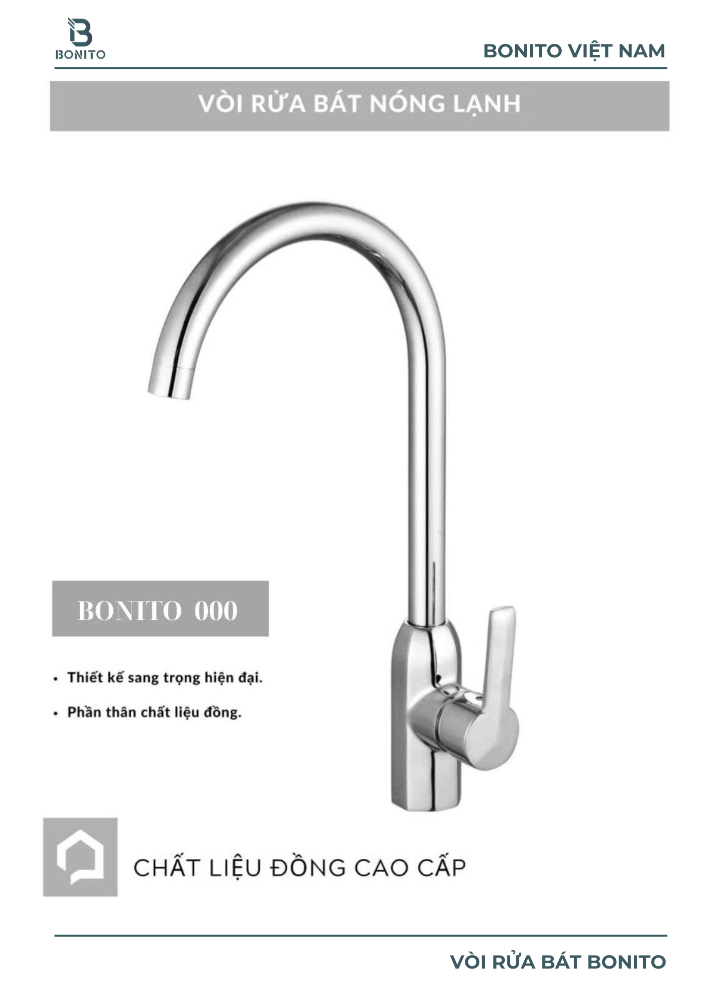 | Vòi rửa bát Bonito 000 sở hữu thiết kế sang trọng và tinh tế, phù hợp với mọi không gian bếp hiện đại. Thân vòi được làm từ chất liệu đồng cao cấp, phủ lớp mạ sáng bóng chống gỉ sét, đảm bảo độ bền vượt trội theo thời gian. Sản phẩm mang lại sự tiện nghi và thẩm mỹ cao cho căn bếp của bạn. |