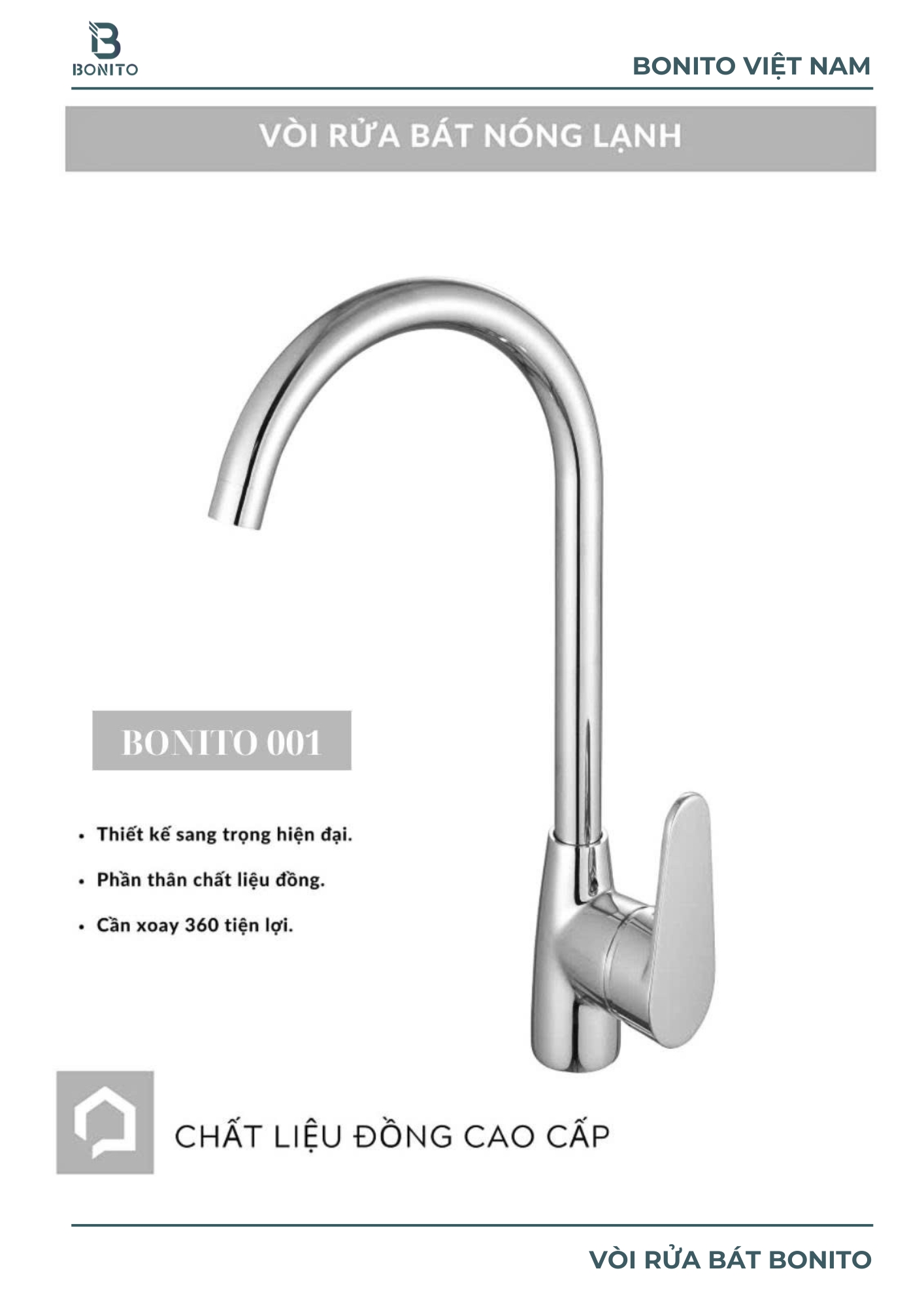 | Vòi rửa bát Bonito 001 được thiết kế hiện đại với cần xoay 360 độ, giúp việc rửa bát, rau củ dễ dàng hơn. Thân vòi chế tạo từ đồng nguyên khối bền chắc, an toàn cho sức khỏe và thân thiện với môi trường. Kiểu dáng thanh thoát, phù hợp cho mọi phong cách bếp. |
