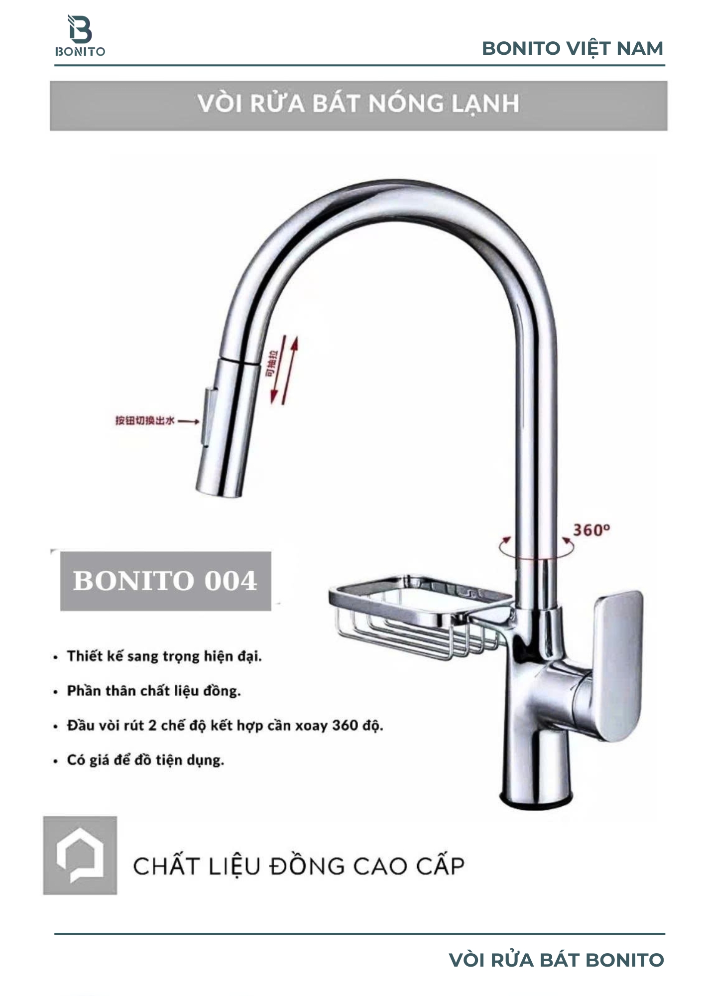 | Bonito 004 nổi bật với đầu vòi rút tiện dụng cùng giá để phụ kiện tích hợp, giúp tiết kiệm không gian và tăng tính tiện lợi. Chất liệu đồng cao cấp chống ăn mòn, xoay 360 độ linh hoạt. Sản phẩm là lựa chọn lý tưởng cho căn bếp tiện nghi và hiện đại. |