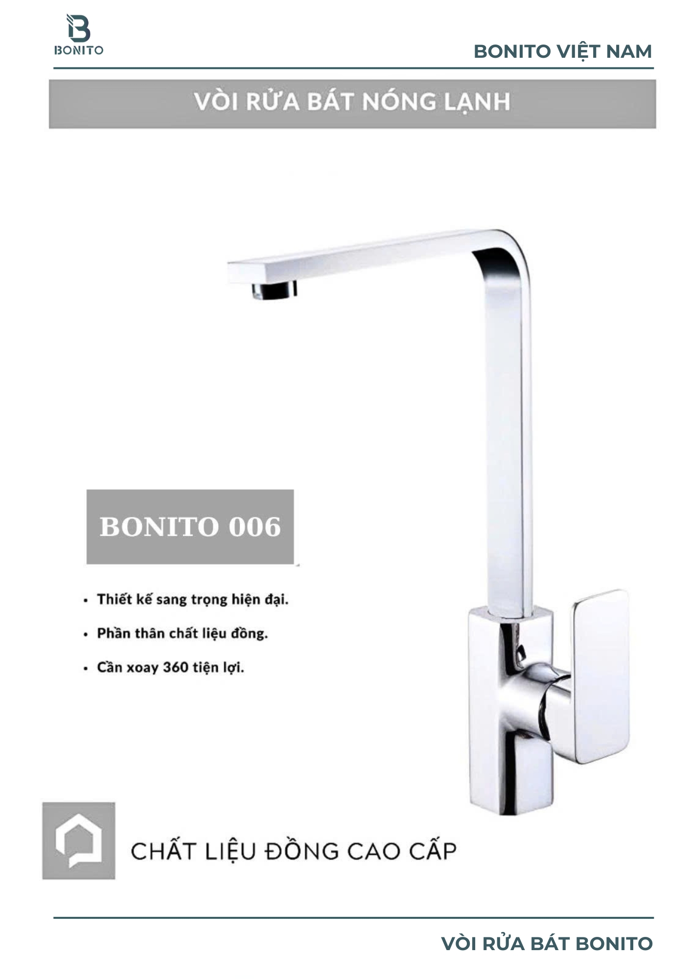 | Bonito 006 mang phong cách thiết kế vuông góc hiện đại, tạo điểm nhấn độc đáo cho không gian bếp. Toàn thân làm từ đồng cao cấp mạ crom sáng bóng, khả năng xoay 360 độ linh hoạt giúp thao tác rửa nhanh chóng và thuận tiện. |