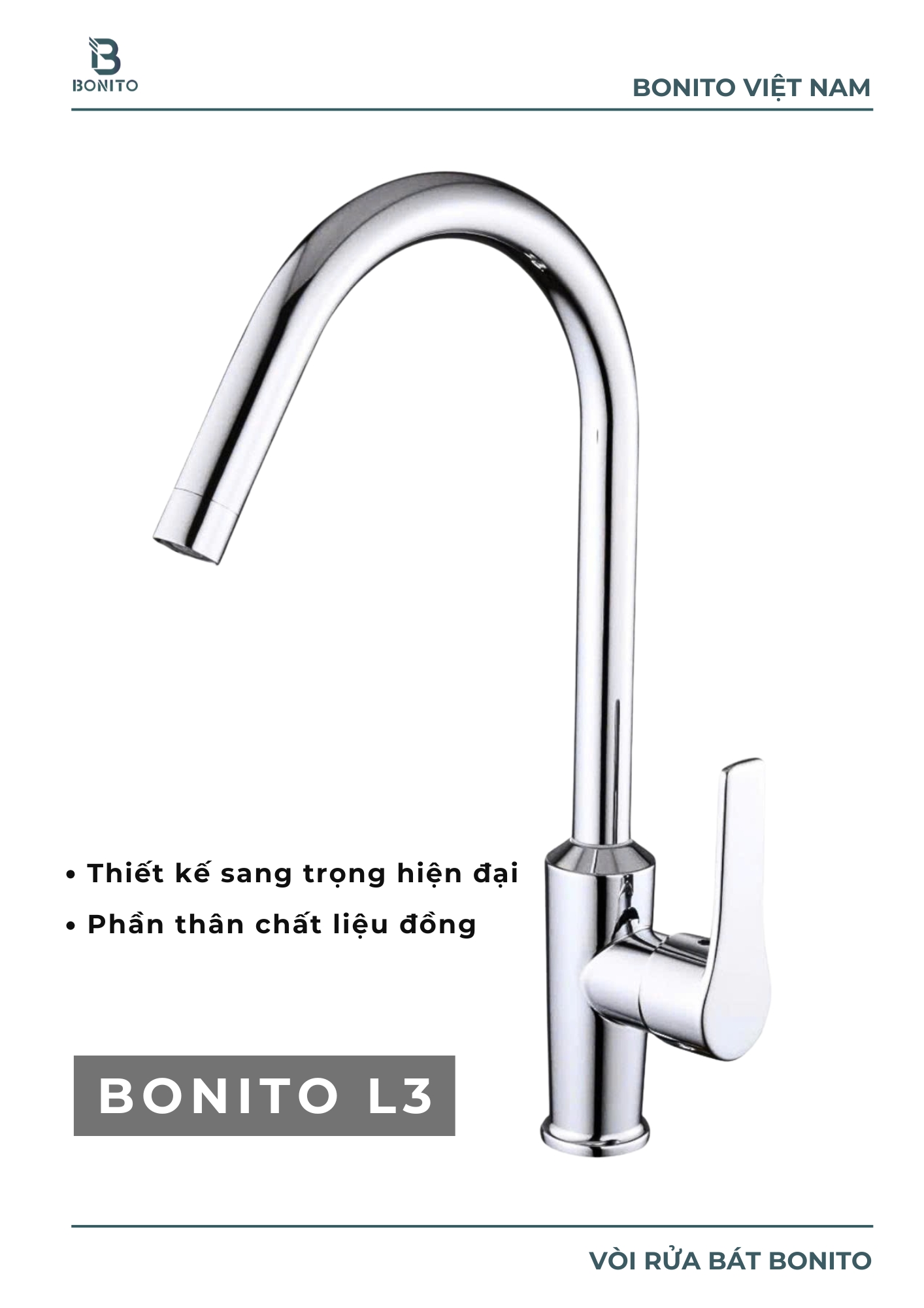 | Bonito L3 sở hữu kiểu dáng mềm mại, đường cong tinh tế cùng lớp mạ sáng bóng sang trọng. Được làm từ chất liệu đồng thau nguyên chất, sản phẩm bền đẹp theo thời gian, thích hợp với mọi không gian bếp từ cổ điển đến hiện đại. |