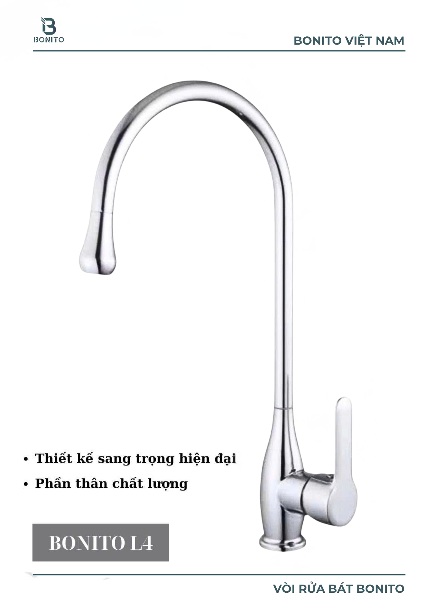 | Bonito L4 nổi bật với thiết kế cổ cong thanh lịch, thân vòi chắc chắn làm từ đồng cao cấp. Dòng nước chảy êm ái, ổn định, giúp bạn trải nghiệm rửa bát nhẹ nhàng và tiện lợi. Là lựa chọn hoàn hảo cho gia đình yêu thích sự tinh tế. |